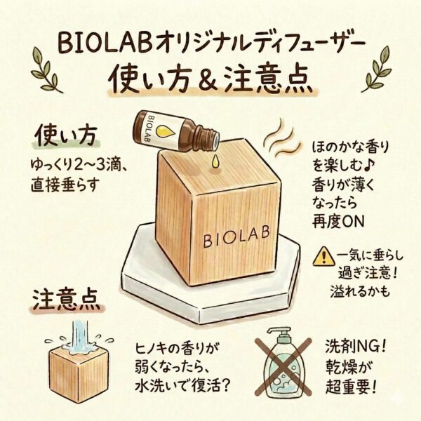 「BIOLABオリジナルディフューザー」はヒノキ製のキューブ